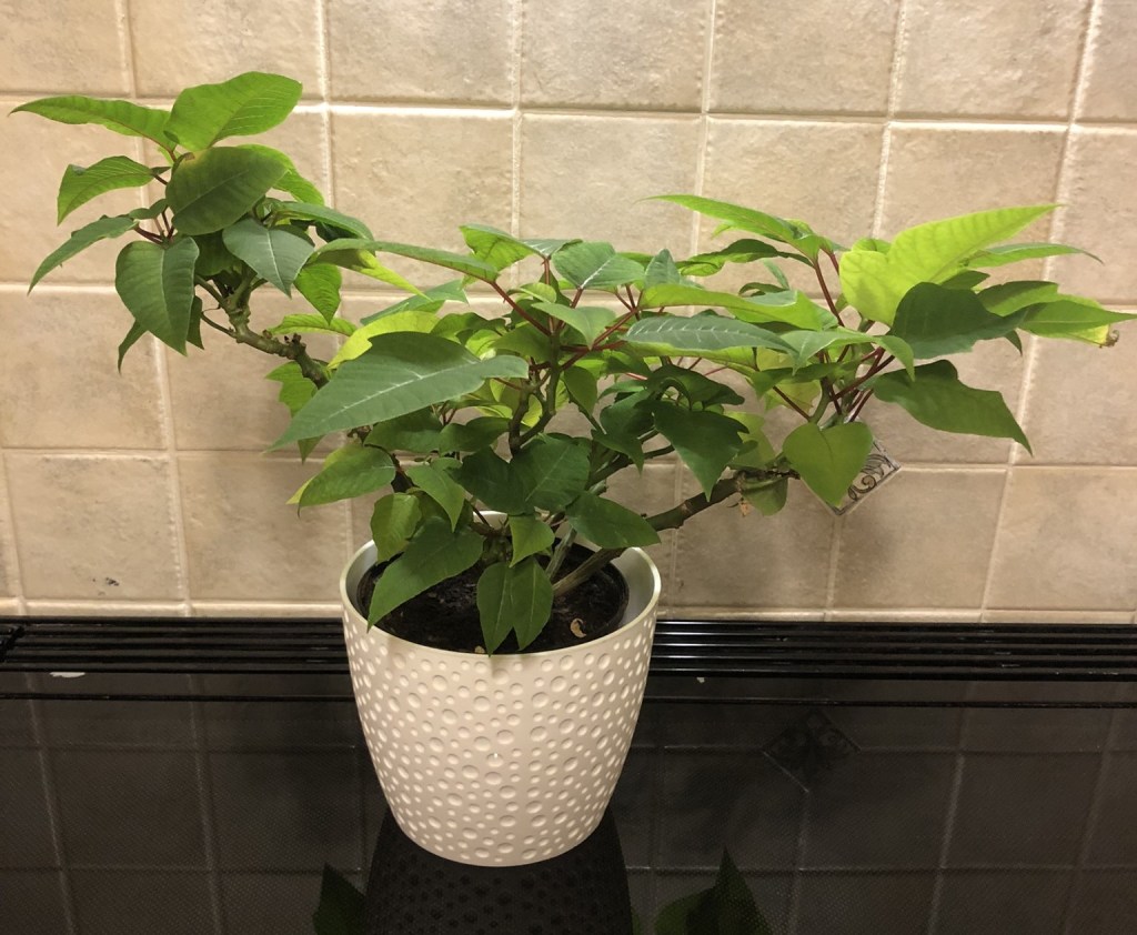 I’ve mentioned before how amazed I am that I’ve managed to keep a poinsettia alive for over a year – it lost the last of its red bracts recently but the leaves are looking exceedingly healthy. In a moment of feeling less bah humbug than usual, I decided to look up how to encourage more red bracts to grow, so it would look festive for Christmas. It seems I’ve done it all wrong. I should have pruned it hard in February and then put it in a mild, shady spot and deprived it of water until May. Then I should have started to water it and repotted it (oh dear, I did that in October), at the same time keeping it as warm and humid as possible. At the end of September I should have plunged it into darkness for 14 hours a day for 8 weeks, before bringing it back into the light and watering it. Crikey, I feel exhausted – I think I need to set up a Gantt chart for next year – I might just buy a new plant!